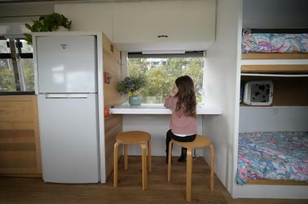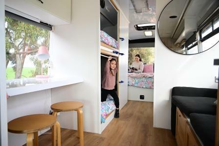 Flo sleeps four people. Two adults in a Queen bed and two small children in the bunk bed.