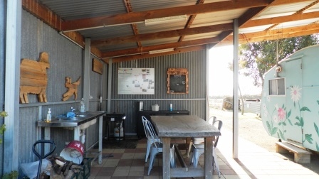 An outdoor kitchen with seating area is where you will do all your cooking. Hot water is provided.